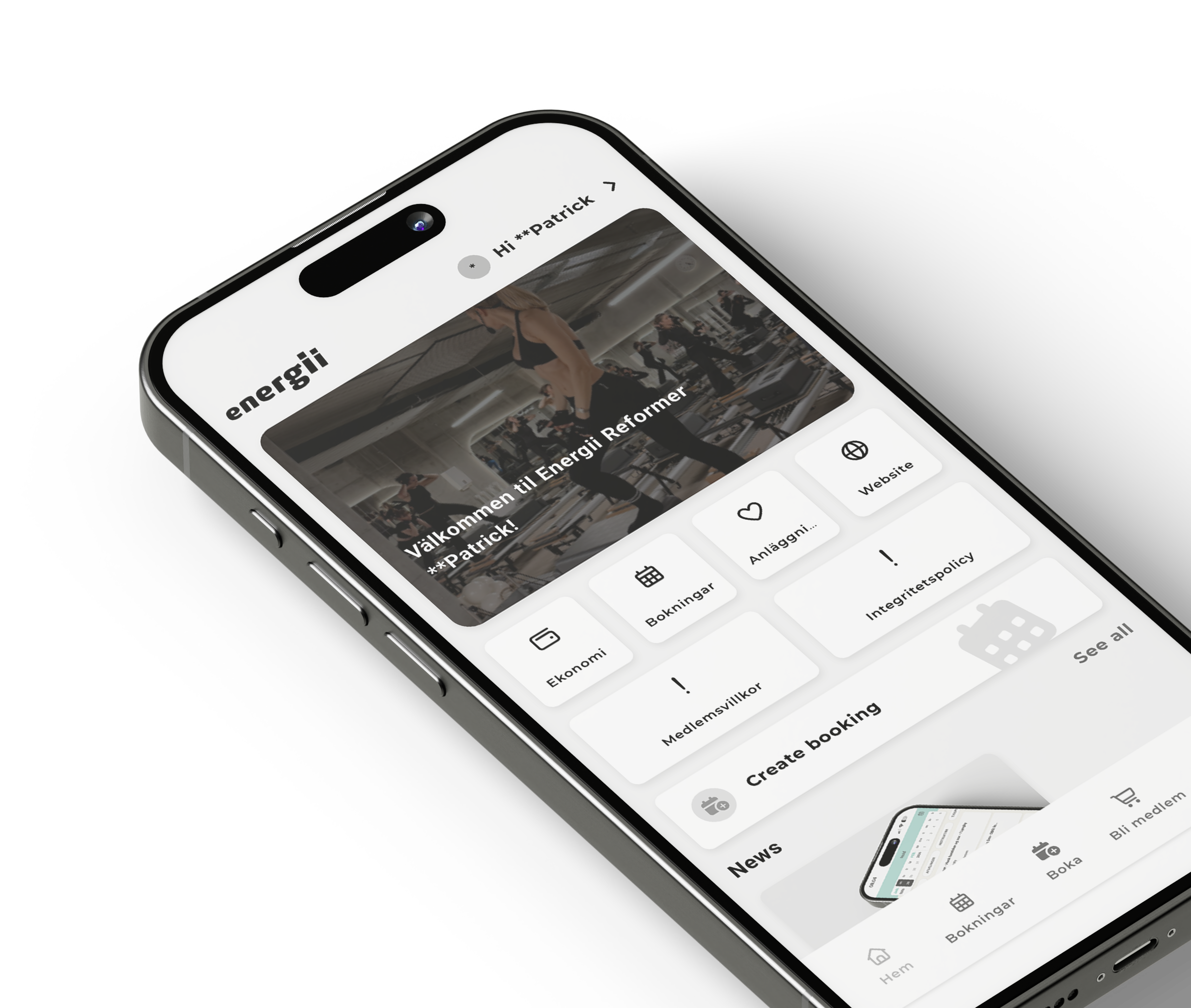 Använd vår Energii-app för att boka pass, se scheman eller hantera dina medlemsuppgifter.